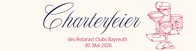 Unsere Charterfeier führt euch nach Bayreuth – eine Stadt mit Geschichte, Kultur und fränkischer Lebensart. Gemeinsam feiern wir 40 Jahre Rotaract Club Bayreuth mit einem festlichen Abend, einem vielseitigen Rahmenprogramm und vielen Gelegenheiten für Austausch, Begegnung und gemeinsame Erlebnisse.